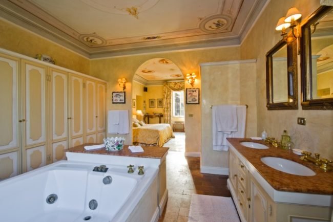 Beautifully decorated ceilings, rich drapery, and vantage points from three separate windows to take in the Tuscan views means honeymoon bliss just got a lot closer.